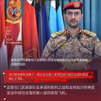 【感觉胡塞已经打出经验了,对美国无人机一点不手下留情】9月7日,胡塞武装在也门马里卜省击落1架MQ-9“死神”无人机,这已经是最新一轮巴以冲突以来,胡塞武装成功击落的第8架MQ-9无人机。